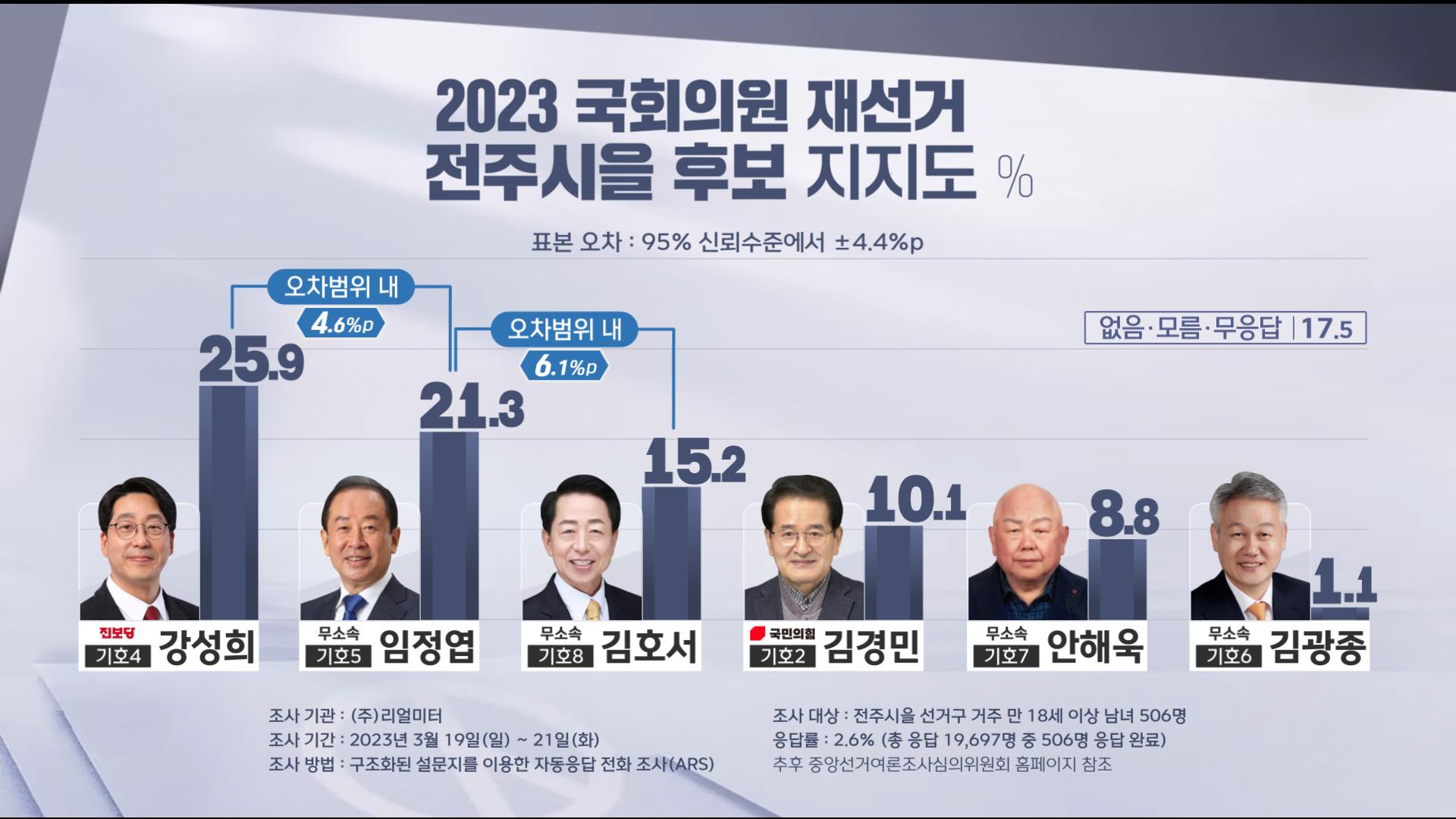 '전주을' 재선거에서 '진보당 강성희 후보'와 '무소속 임정엽' 후보가 선두 경쟁을 벌이는 것으로 조사됐습니다.