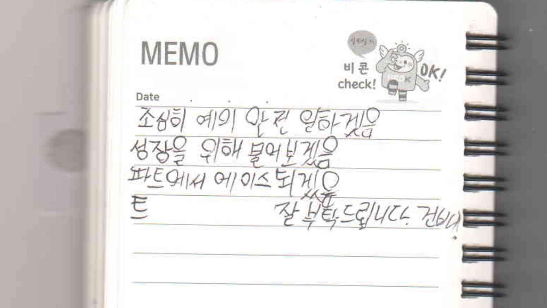 이 수첩의 마지막 장에는 파트 명칭으로 준비한 미완의 건배사가 기록돼 있어 열정으로 가득했던 사회초년생 A군의 모습을 짐작케 합니다.