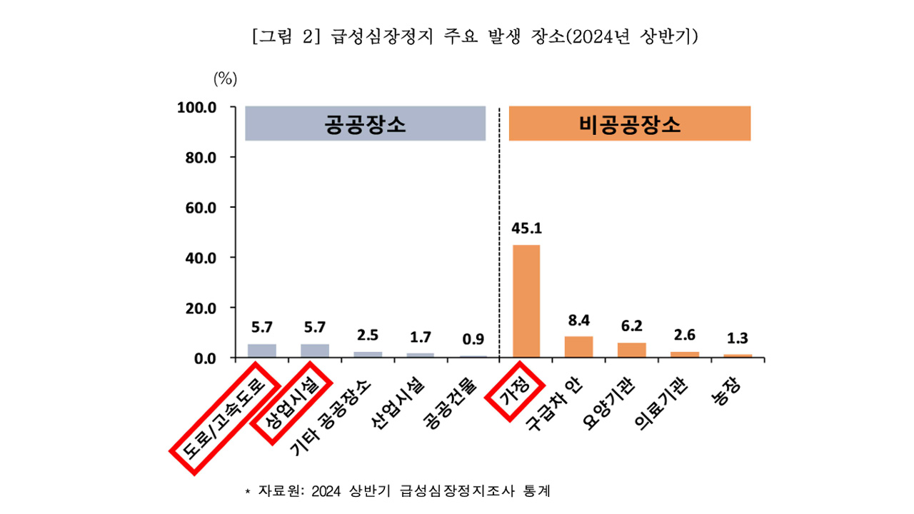 장소별로는 가정에서의 발생이 45.1%로 가장 잦았고, 구급차 이송 중 발생이 8.4%, 요양기관 6.2%, 도로와 상업시설이 각각 5.7% 순이었습니다.