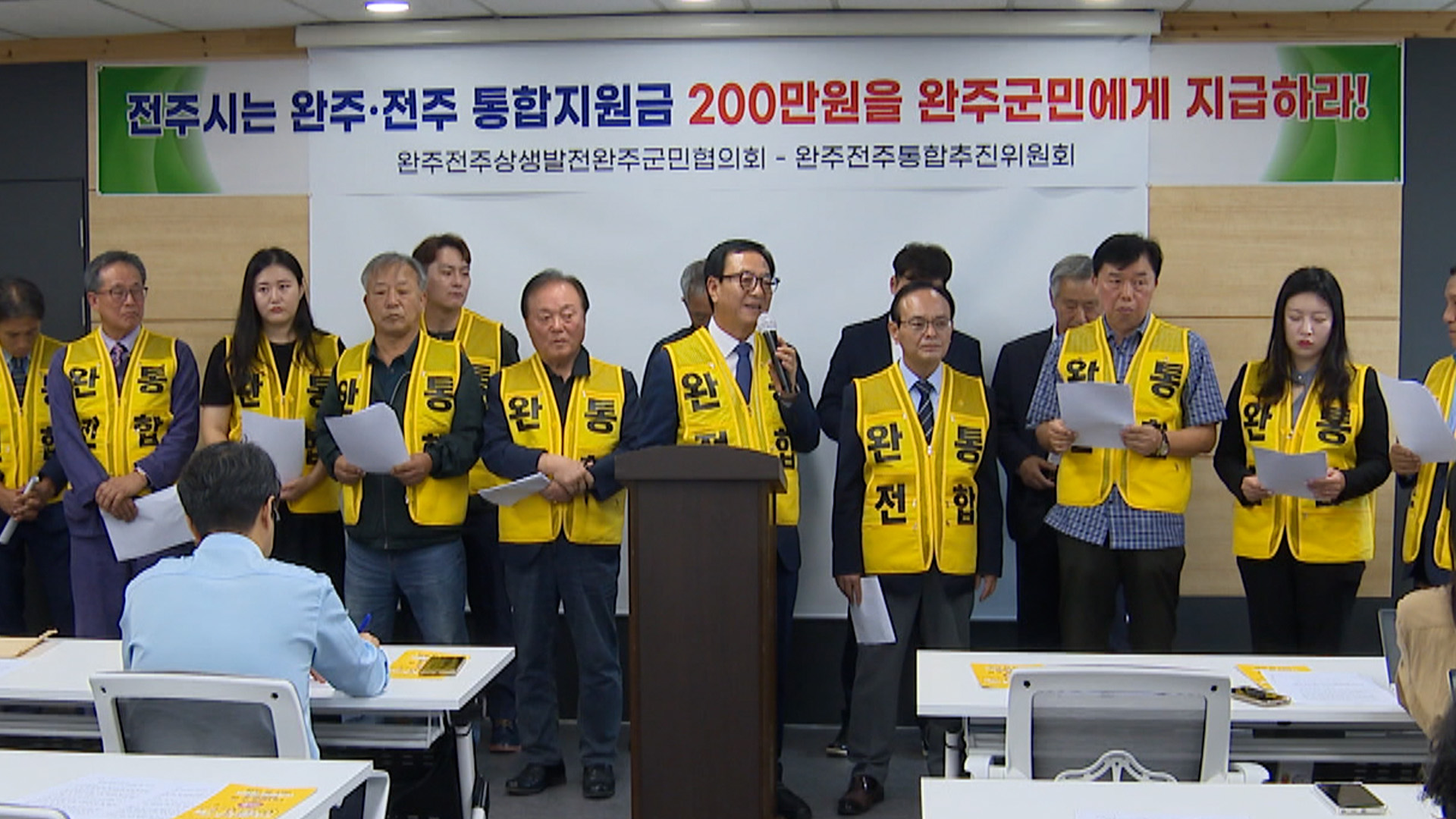 완주·전주 통합추진위원회와 상생발전네트워크는 오늘(15일) 전주시청에서 기자회견을 열고, "완주군민 1인당 200만 원의 통합지원금 지급을 우범기 전주시장과 남관우 전주시의회 의장에게 건의한다"고 밝혔습니다.