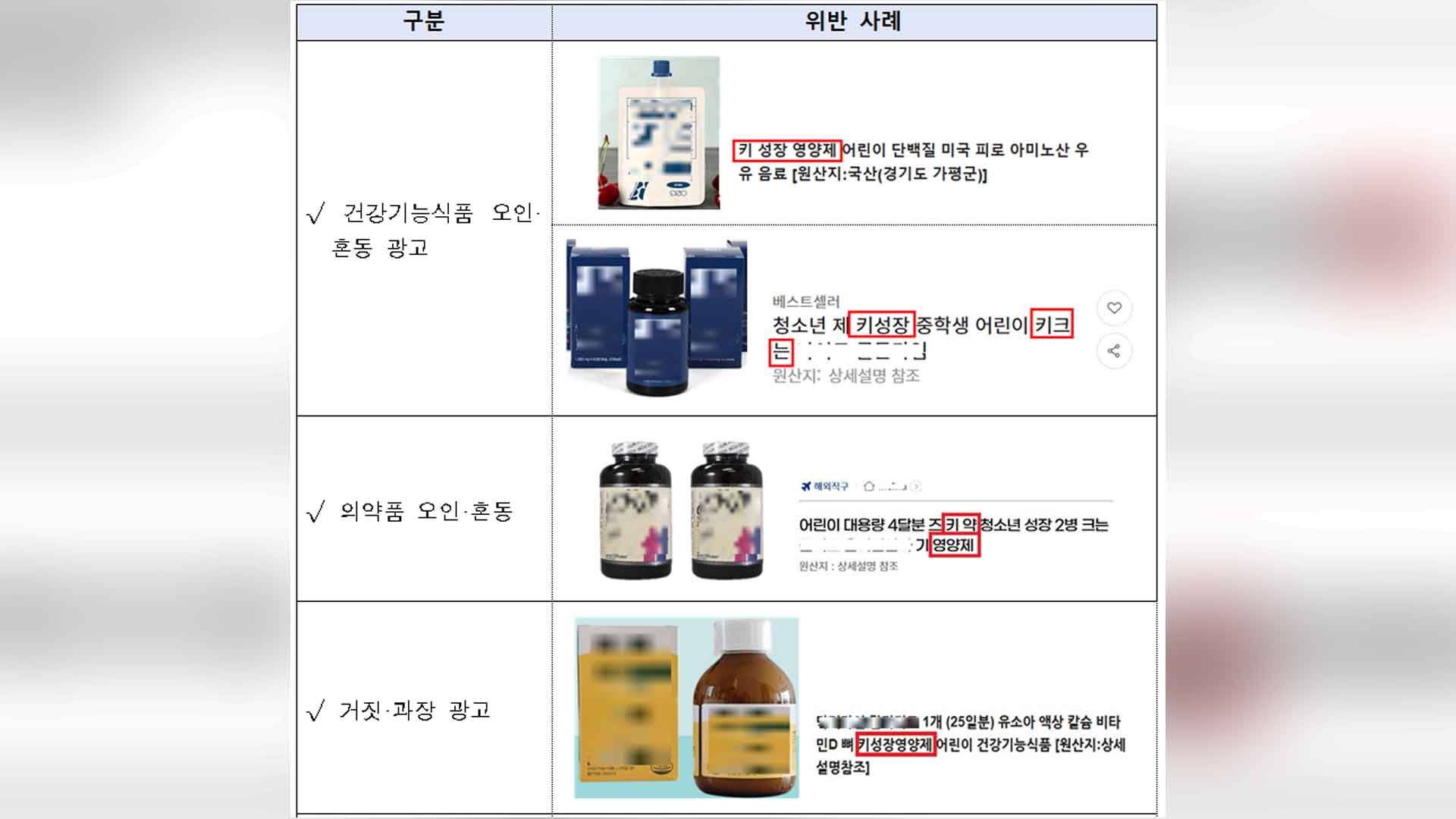 식약처는 자녀 키 성장에 관심이 많은 학부모들이 심리를 이용해 일반 식품을 건강기능식품으로 오인하게 만드는 부당 광고가 상당하다며 온라인 구매 시 건강기능식품 인증 마크 등을 확인해야 한다고 당부했습니다.