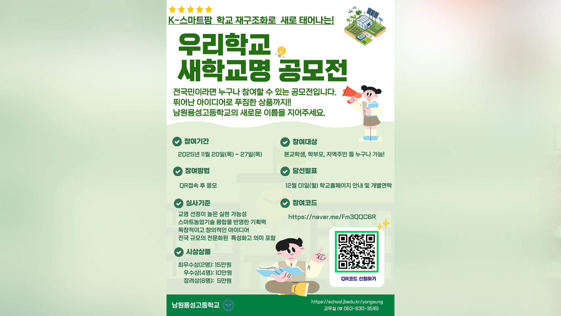 교육부 공모 사업으로 2027년부터 스마트팜과 등 신설 학과로 신입생을 모집할 예정인 남원 용성고등학교는 내일(20일)부터 8일 동안 지역 전략 산업 연계 등을 취지로 교명 변경을 위한 공모전을 실시한다고 밝혔습니다.
