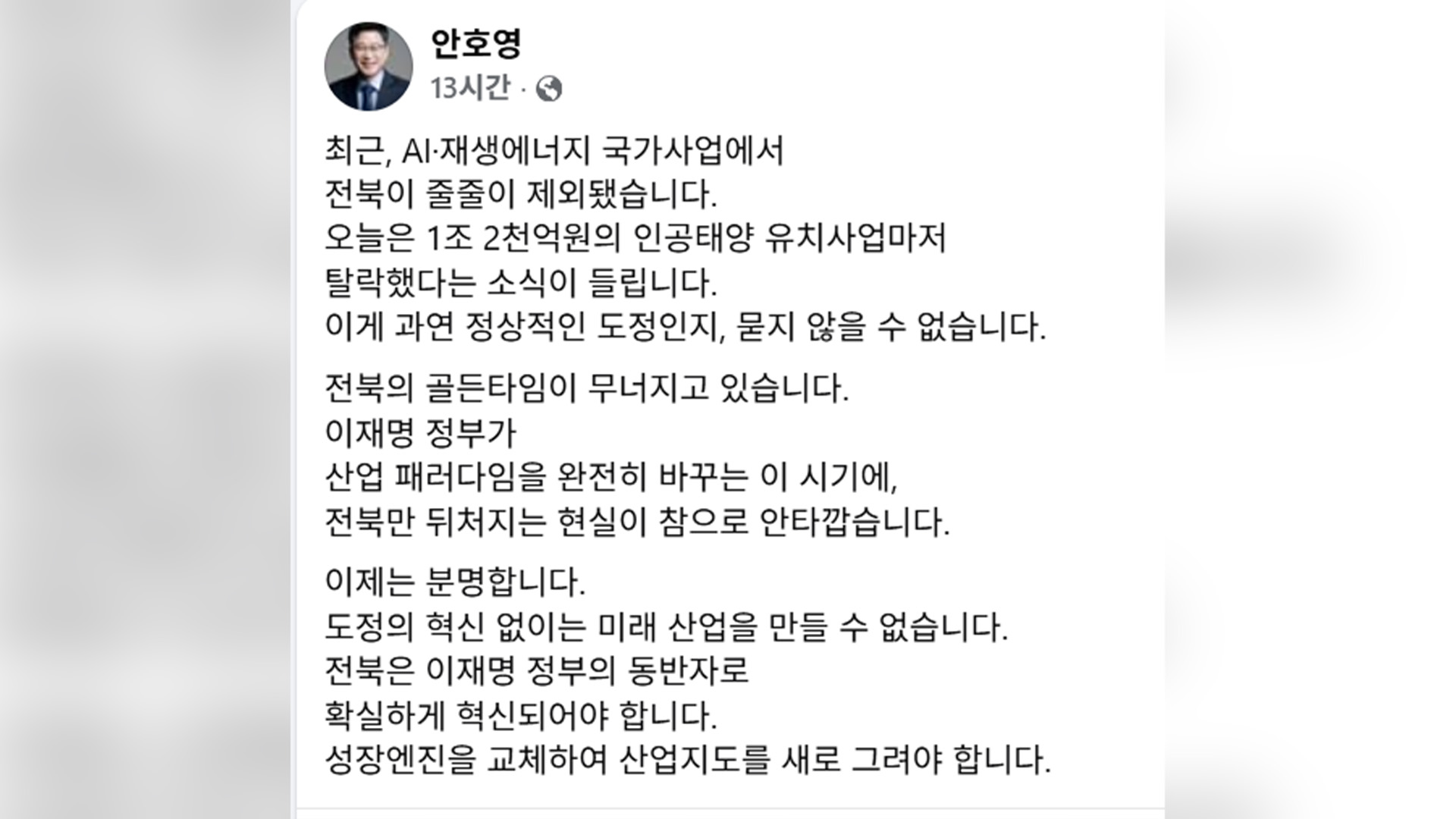 반면 내년 지방선거 전북도지사 후보군인 안호영 의원은 자신의 SNS를 통해 "이게 과연 정상적인 도정인지 묻지 않을 수 없다"며 유치사업에서 탈락한 책임을 김관영 지사에게 돌렸습니다.