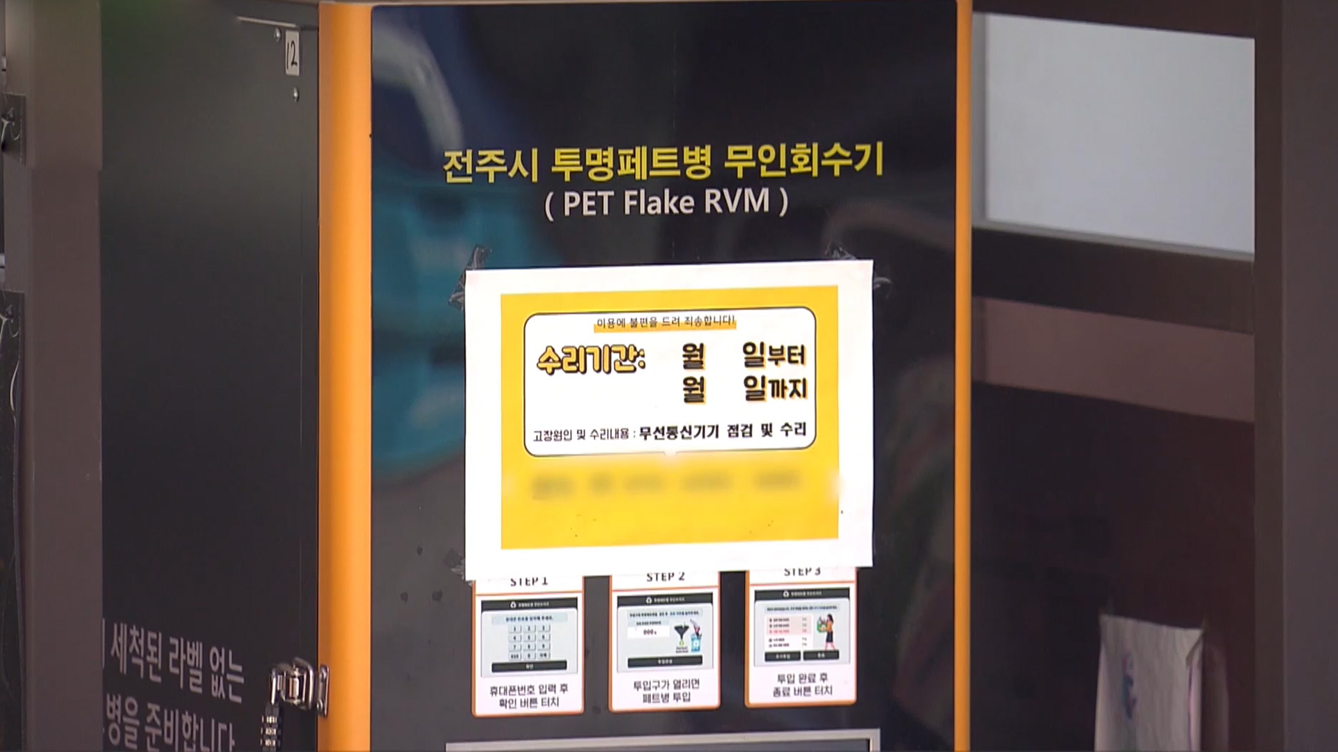 전주시의회 최서연 의원은 투명폐트병 무인회수기 40여대가 전주시내에 설치됐지만, 고장 횟수가 기계당 평균 다섯 차례에 이르고 길게는 2달까지 수리되지 않은 채 방치되고 있다고 지적했습니다.