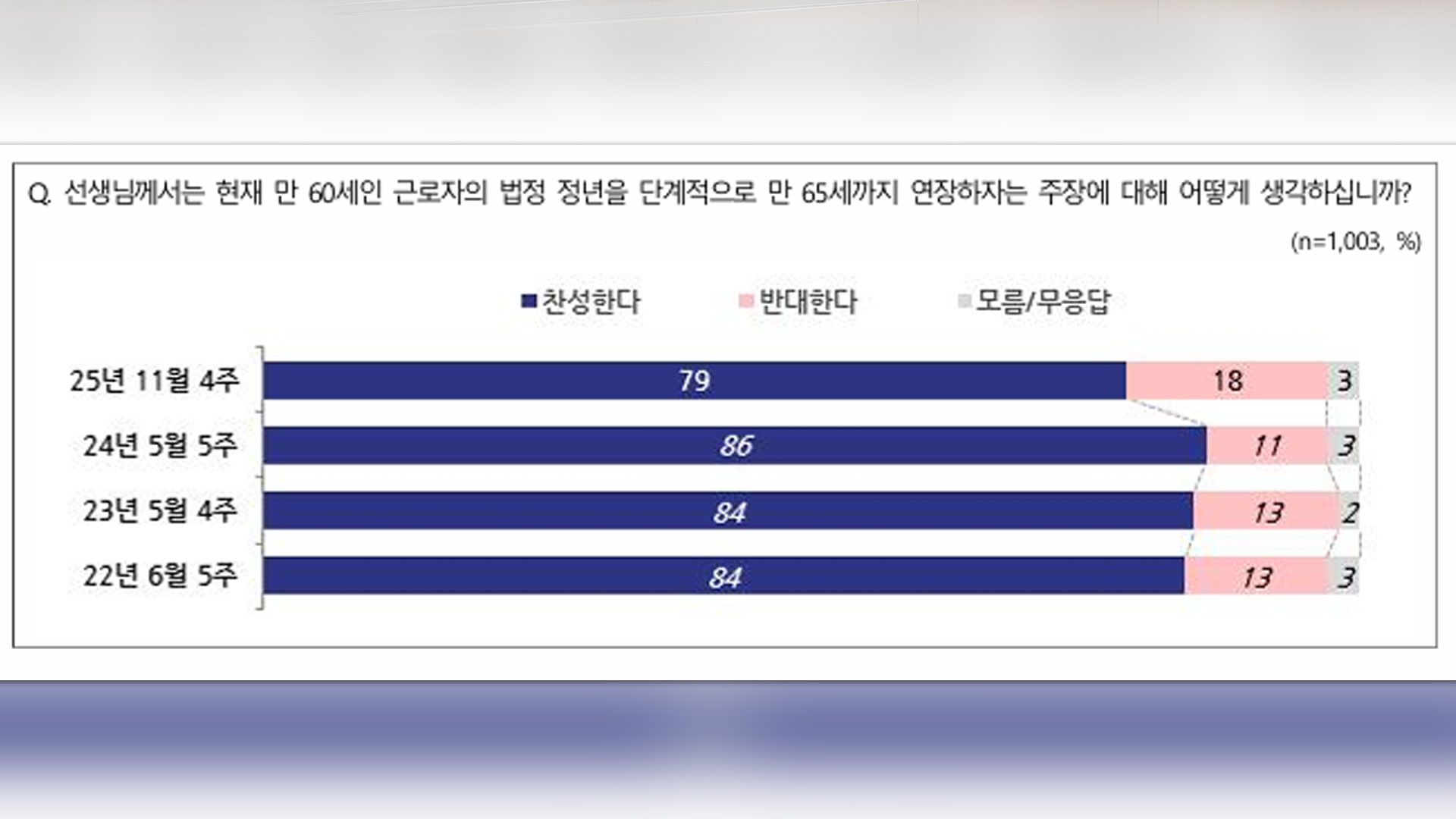엠브레인퍼블릭·케이스탯리서치·코리아리서치·한국리서치가 지난 24일부터 26일까지 만 18세 이상 남녀 1003명을 대상으로 실시한 전국지표조사(NBS) 결과에 따르면, 정년 연장에 '찬성한다'는 의견이 79%, '반대한다'는 의견 18%로 나타나, 찬성이 반대 보다 4배 이상 높았습니다.