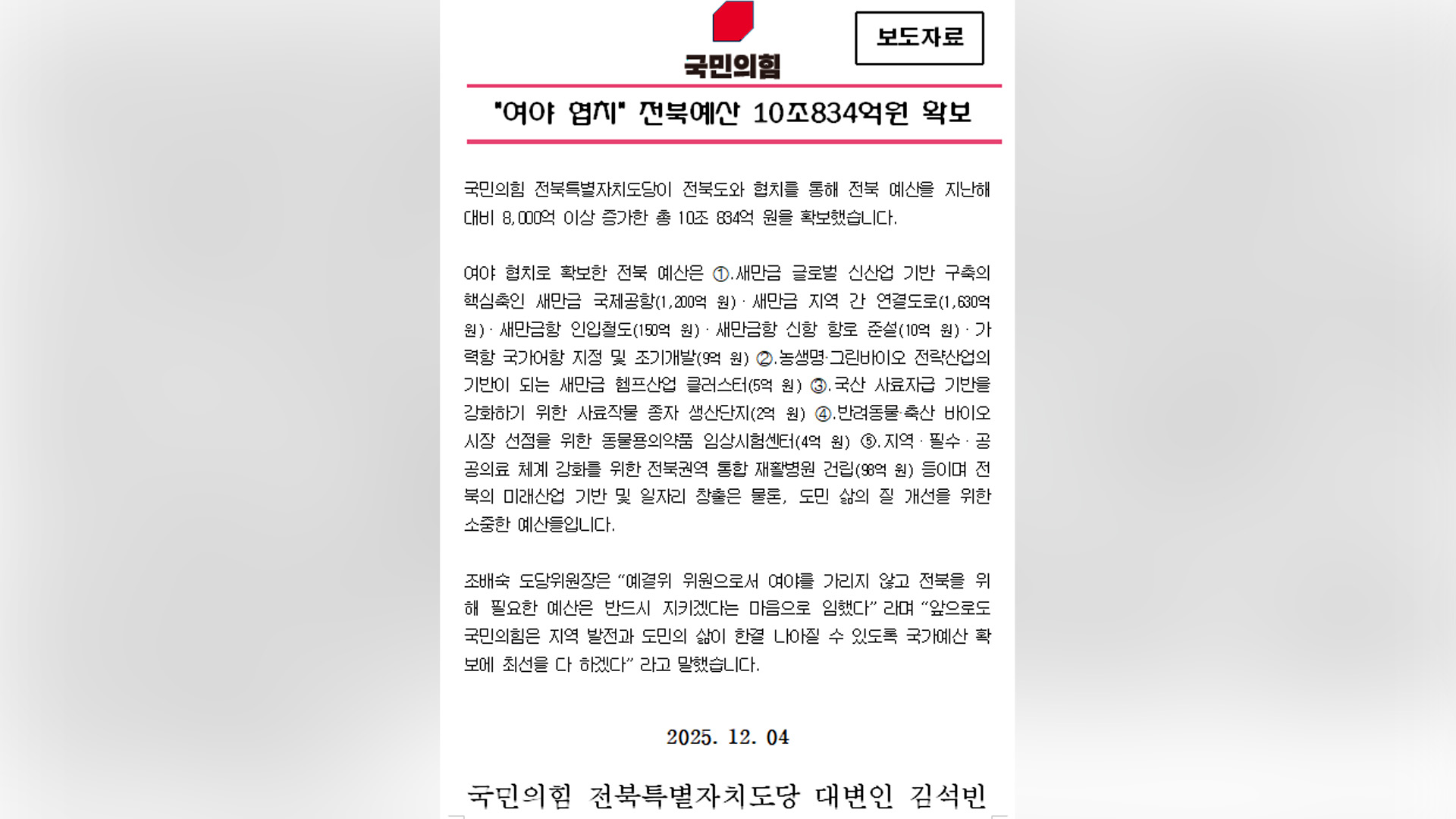 전북도당은 보도자료를 통해 1천억 규모의 '새만금 국제공항'과 '새만금 지역 간 연결도로' 등 다섯 가지 분야 사업 예산을 전북도와 협력해 안정적으로 확보하면서 10조 예산을 달성했다고 밝혔습니다.