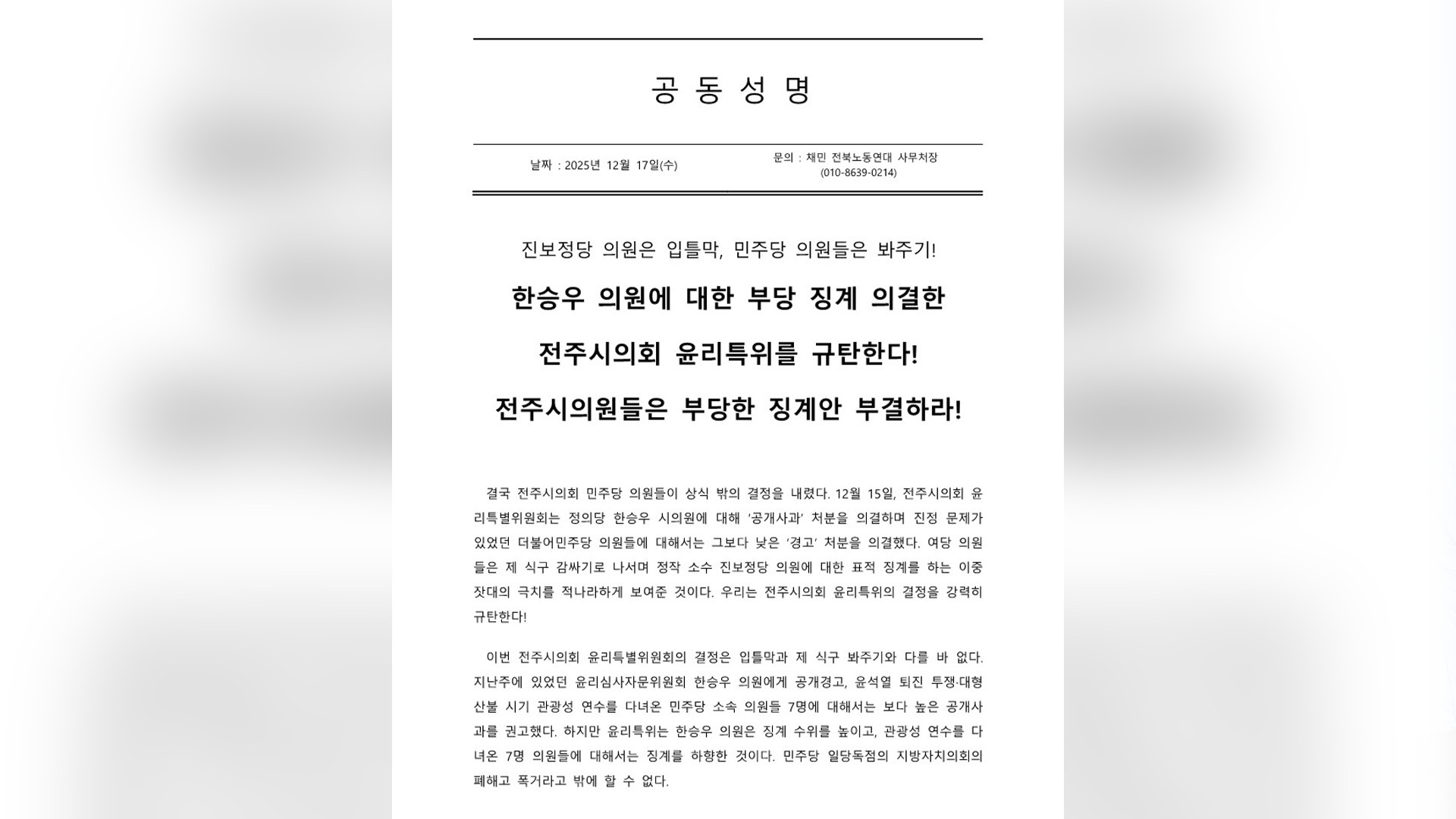 단체들은 내일(18일) 열리는 전주시의회 본회의에서 부당한 징계안을 부결할 것을 시의원들에게 촉구했습니다.