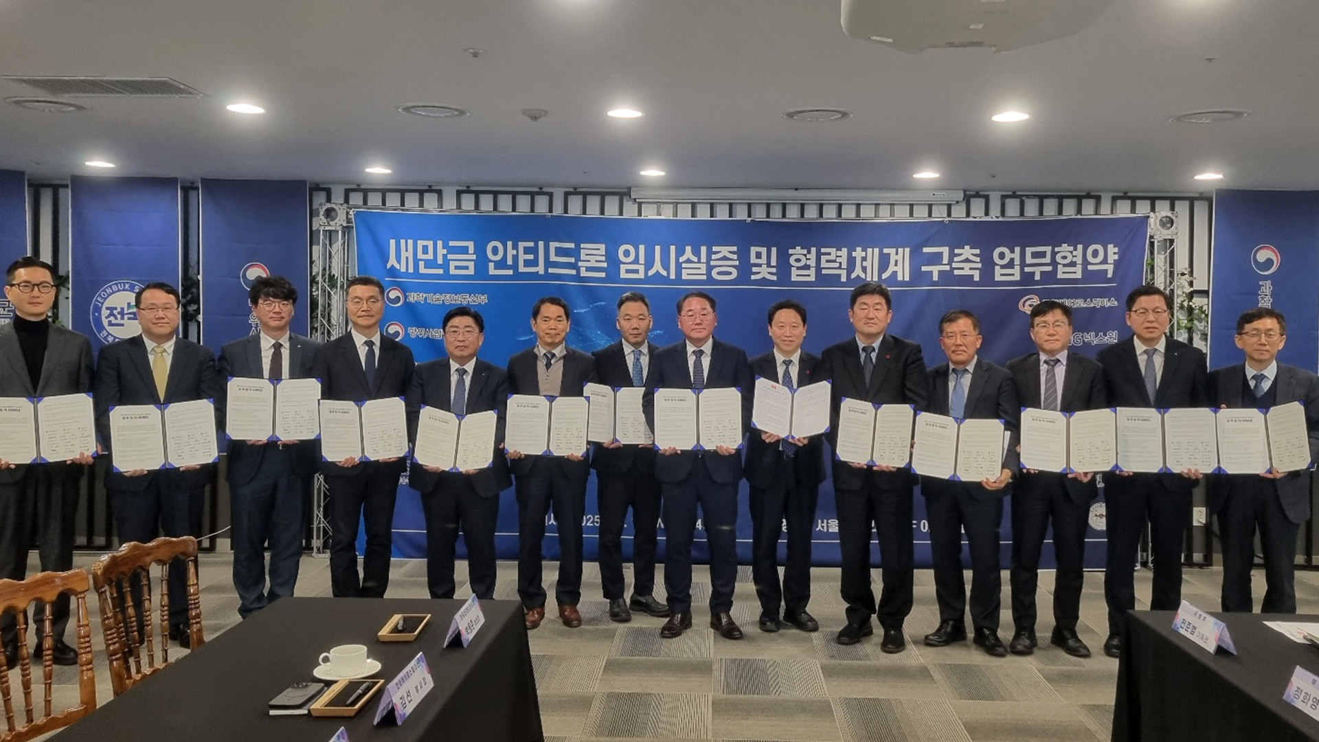 전북자치도는 새만금 안티드론 임시 실증 및 협력체계 구축을 위해 과학기술정통부와 방위산업청, 한화에어로스페이스 등 정부기관, 방산기업들과 업무협약을 맺었습니다.