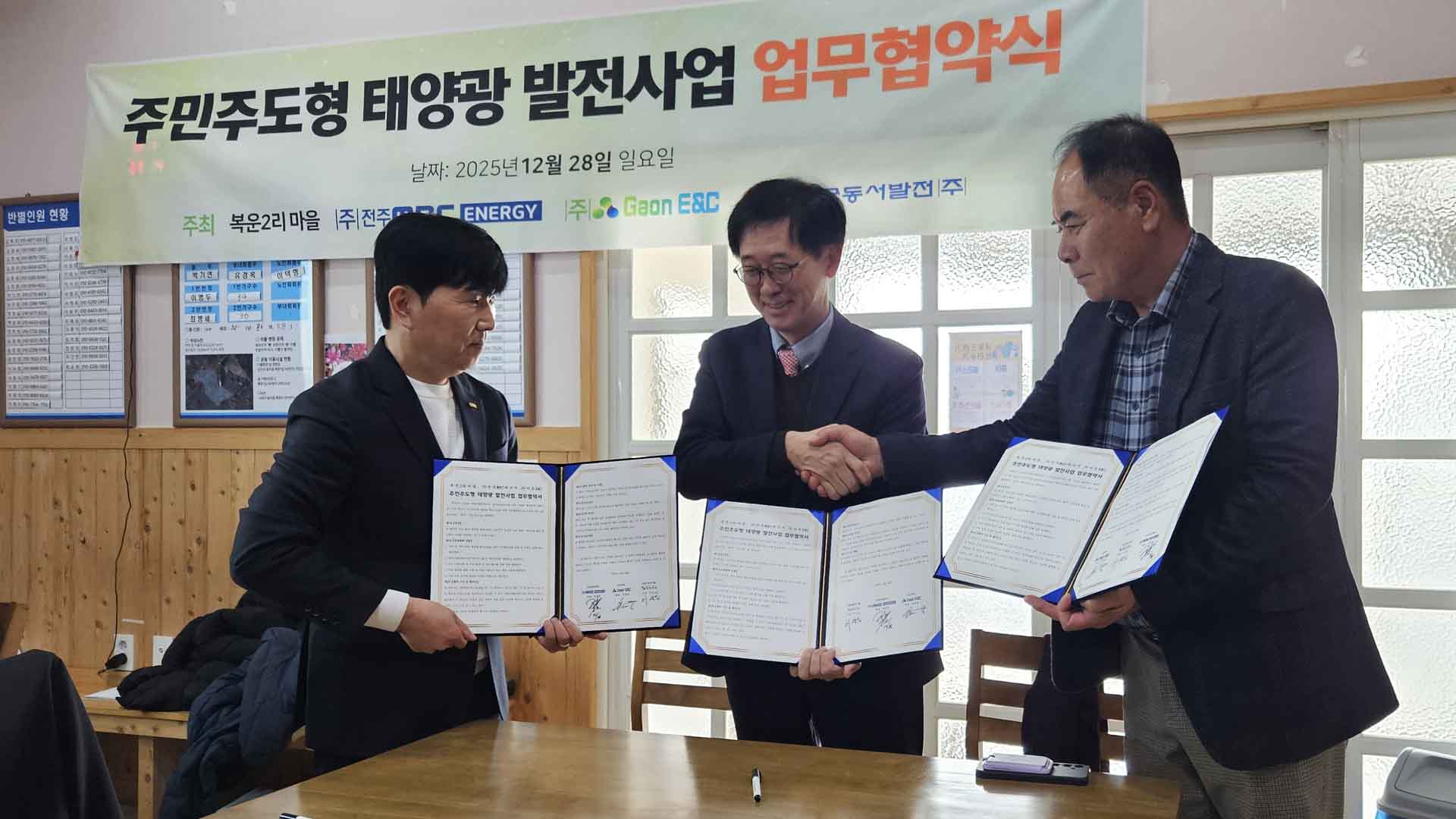 ㈜전주MBC에너지와 ㈜가온ENC, 충남 당진 복운2리 마을이 태양광 발전사업을 위해 손을 맞잡았습니다.