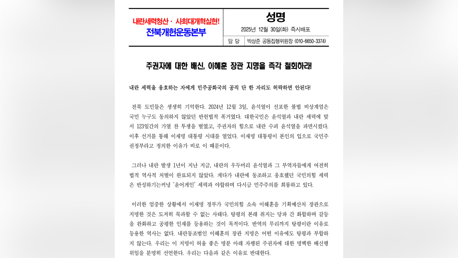 전북개헌운동본부는 오늘(30일) 성명을 통해, 윤 전 의원은 내란 수괴의 동조자이자 지지라며, 이 전 의원을 장관직에 앉히는 것은 민주주의 시계를 거꾸로 돌리는 일이라고 비판했습니다.