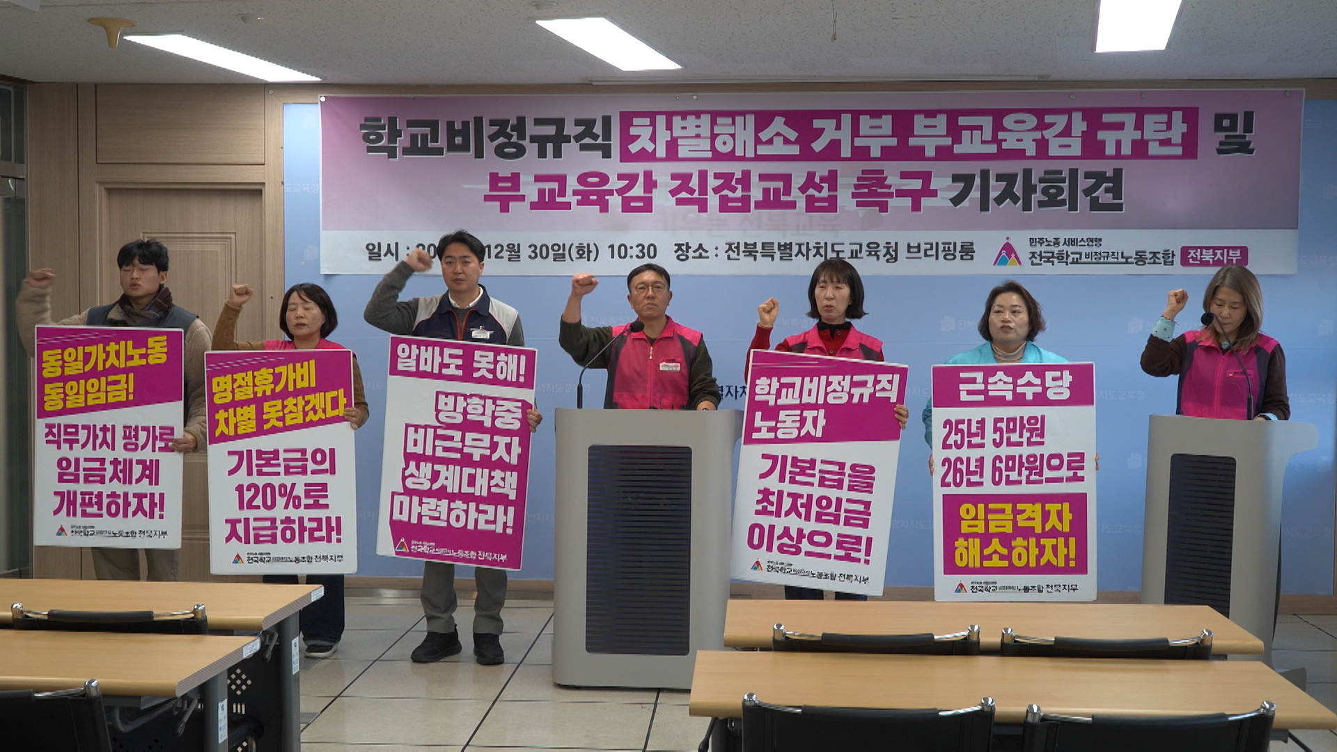 민주노총 전국학교비정규직노조는 오늘(30일) 전북교육청에서 기자회견을 열고 전국 교육감들의 책임 회피로 형식적인 교섭만 반복되며 연내 타결이 불발돼 결국 새해부터 교섭을 해야 하는 상황이라고 비판했습니다.