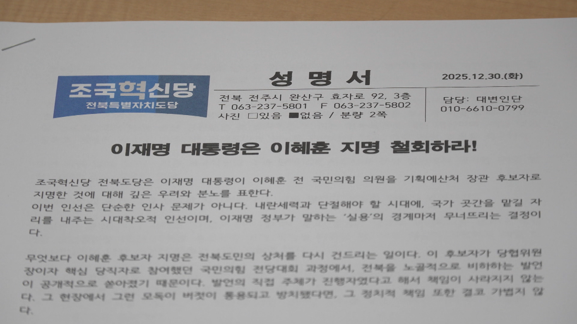 조국혁신당 전북자치도당은 오늘(30일) 이재명 대통령이 이 전 의원을 장관 후보자로 지명한 것은 단절하고 단죄해야 할 내란 세력에게 국가 곳간을 맡기는, 시대착오적 인선이라고 비판했습니다.
