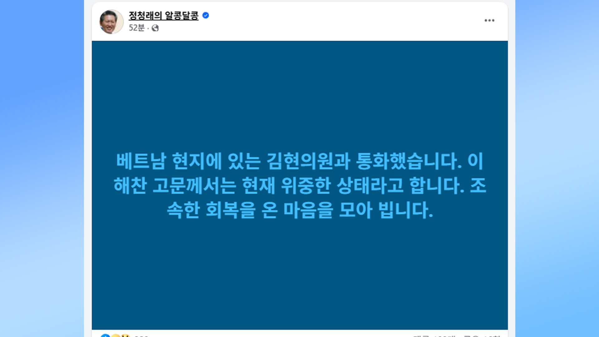 정 대표는 오늘(24일) 오전 자신의 SNS에 “베트남 현지에 있는 김현 의원과 통화했습니다. 이해찬 고문께서는 현재 위중한 상태라고 합니다”라고 밝혔습니다.