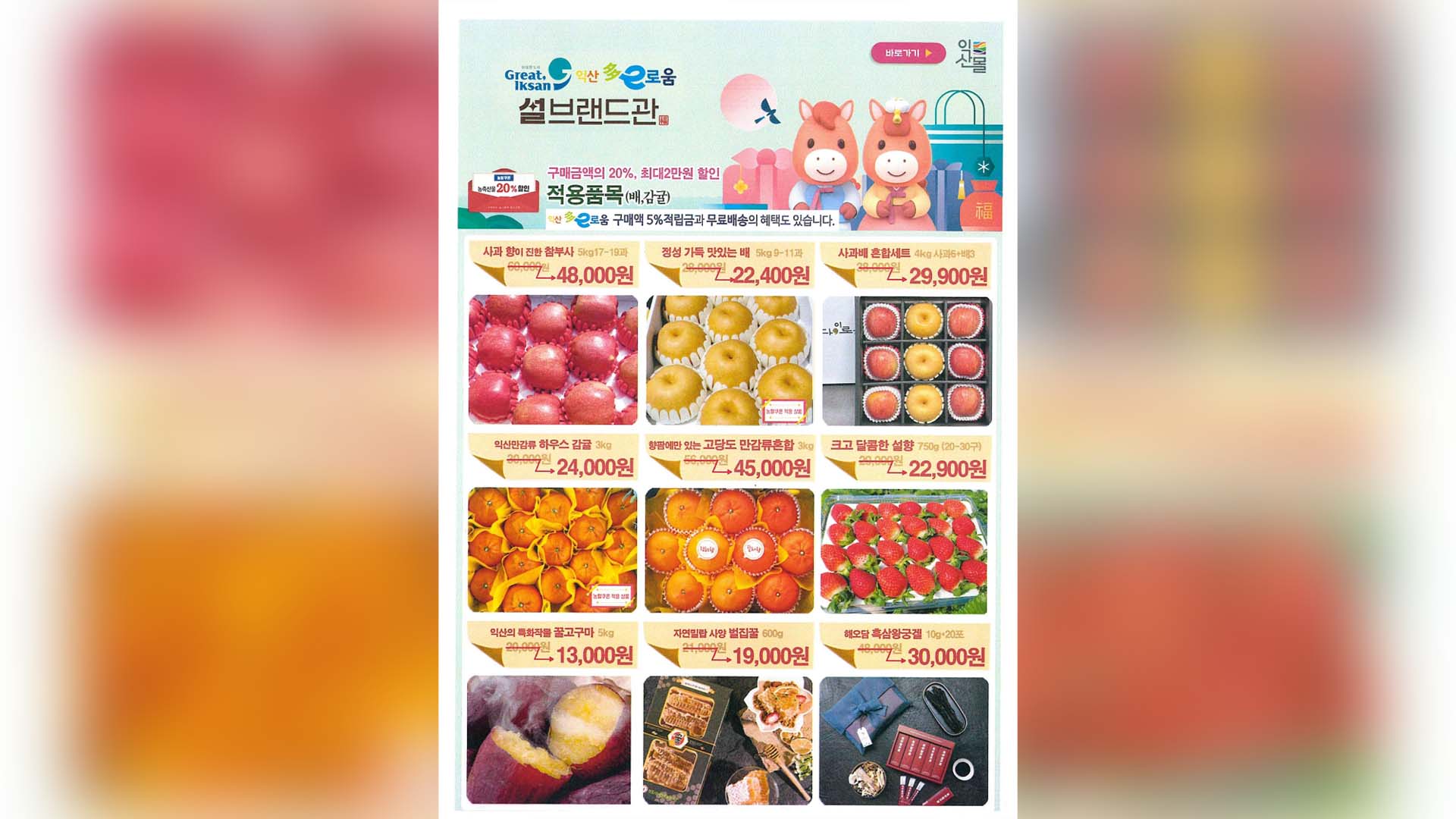 또 익산몰 회원에게는 설 기획전 품목을 최대 20% 할인하고, 전국 무료배송으로 명절 선물을 보다 편리하게 준비할 수 있습니다.