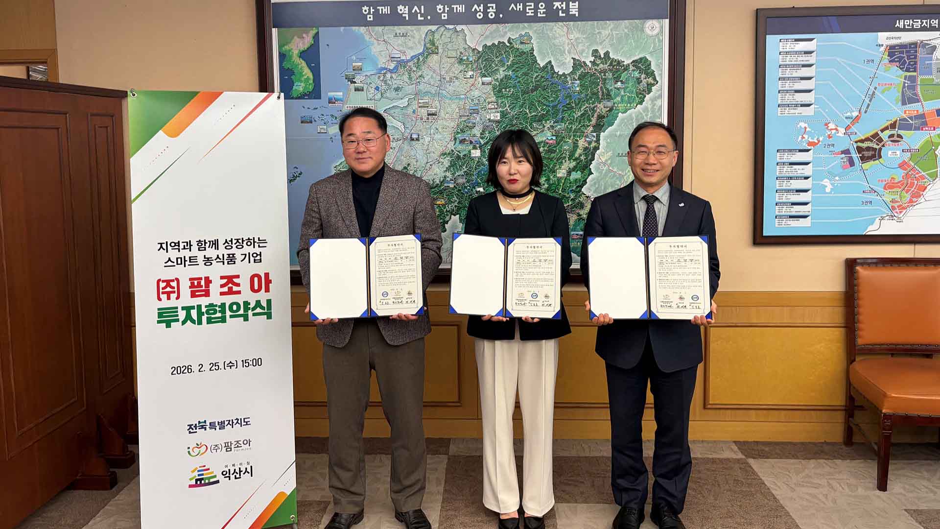 농식품 가공 기업 팜조아가 전북자치도청에서 전북도, 익산시와 투자협약을 체결하고 100억 원을 투자해 익산 제4산업단지 공장 증설에 나섭니다.