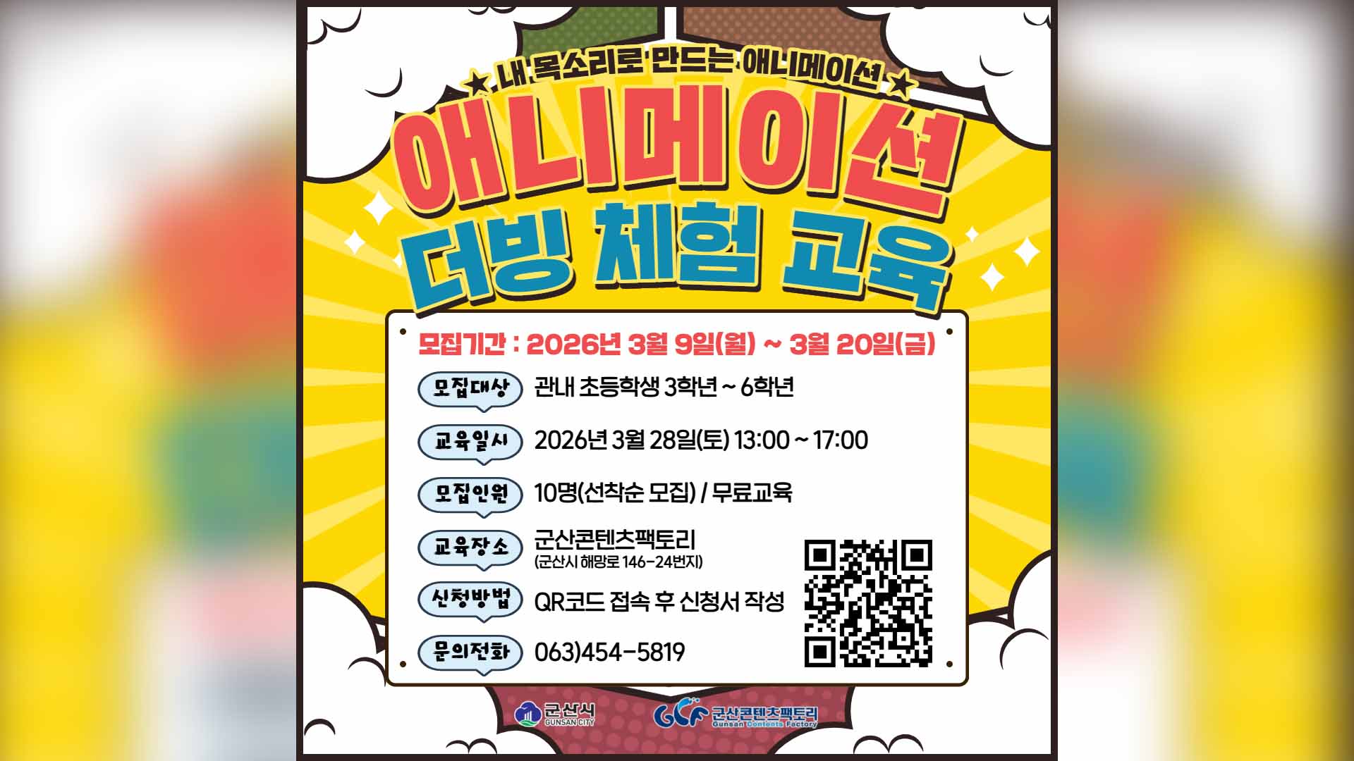 군산콘텐츠팩토리는 초등학생을 대상으로 애니메이션 더빙 체험 교육을 무료로 마련하고 오는 9일부터 20일까지 선착순 10명을 모집합니다.