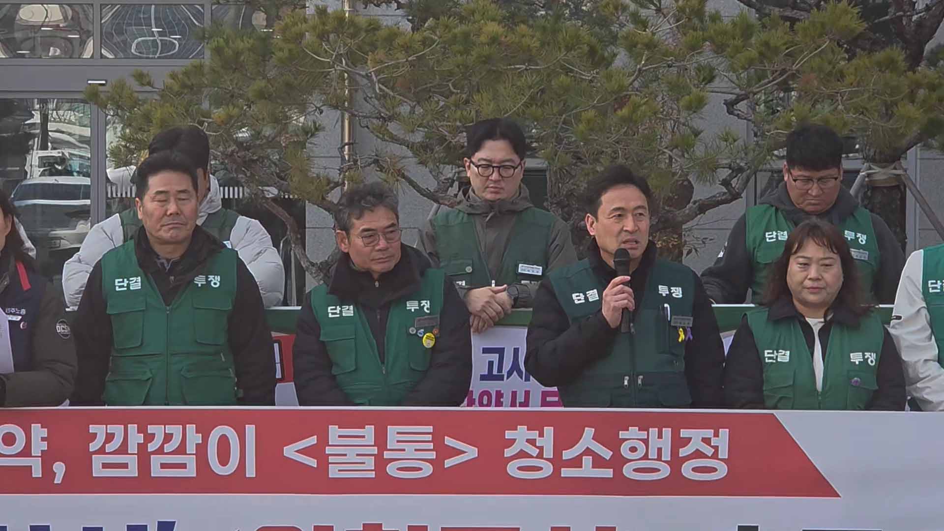 민주노총 전국민주연합노조는 오늘(10일) 기자회견을 열고 주변 시군 노동자들과 비교해 임금도 천여만 원 넘게 차이나는데 인력도 업체당 최대 8명까지 감축하려 한다며, 대행업체 대신 진짜 사장인 익산시가 직접 교섭에 나서 문제를 해결하라고 촉구했습니다.