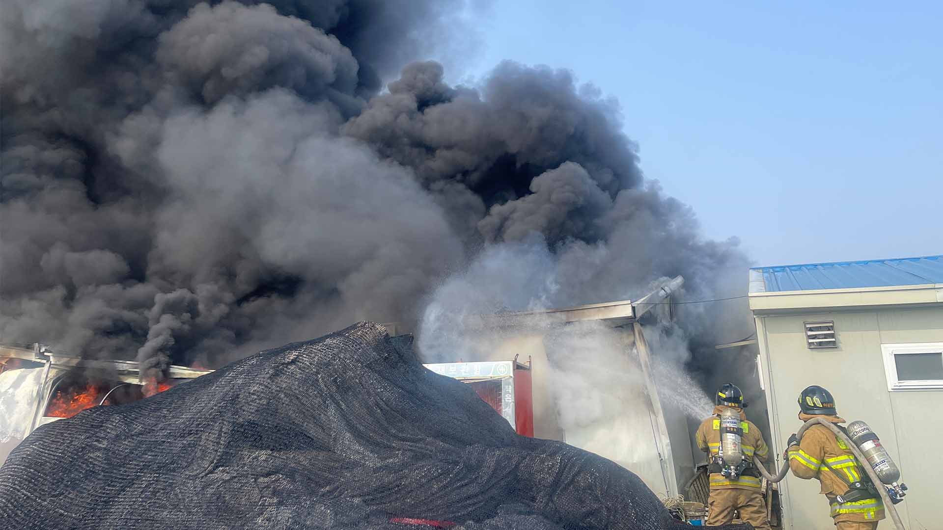 해당 현장사무소는 하수도 공사 업무 처리를 위해 지어진 임시 건물로, 화재 당시 안팎에서 근무하던 9명이 대피해 다친 사람은 없었습니다.