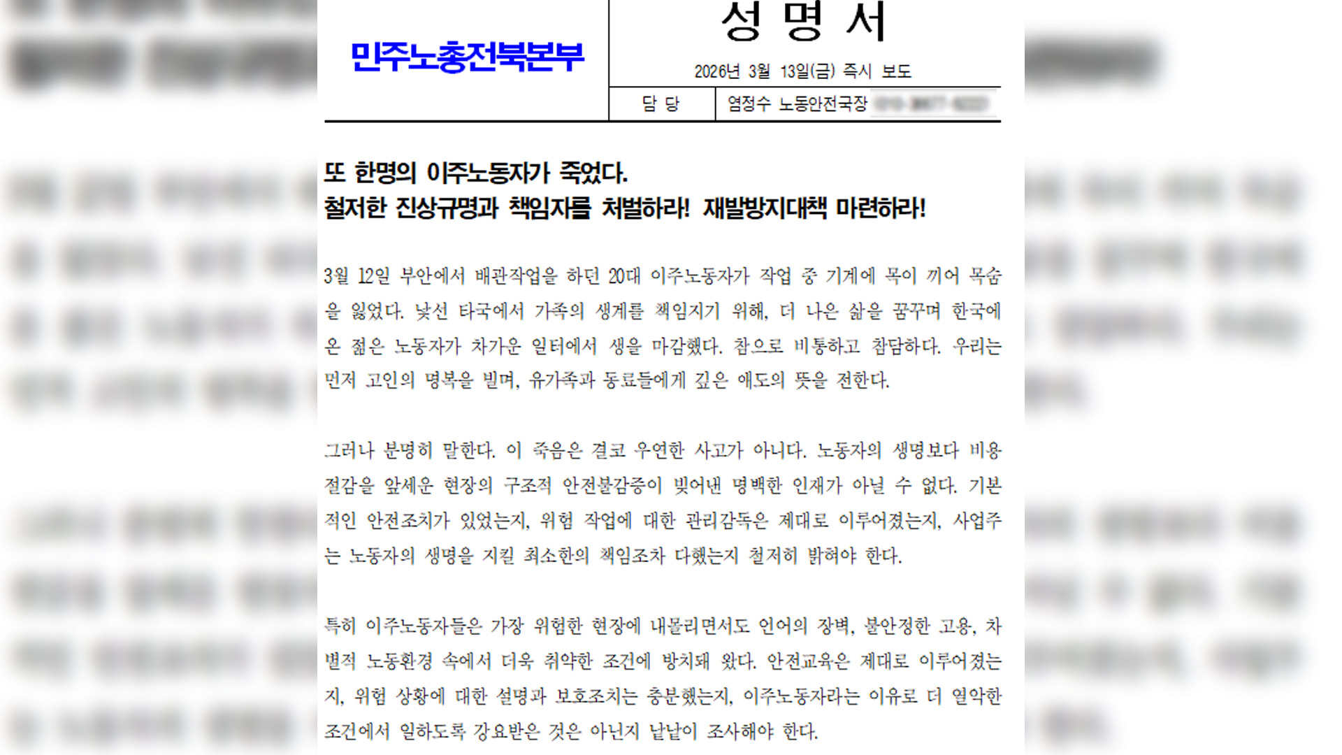 민주노총 전북본부는 오늘(13일) 성명을 통해, 사업주가 안전 조치나 관리 감독으로 노동자의 생명을 지키려는 책임을 다했는지를 철저히 수사하고, 재발 방지 대책을 마련하라고 촉구했습니다.