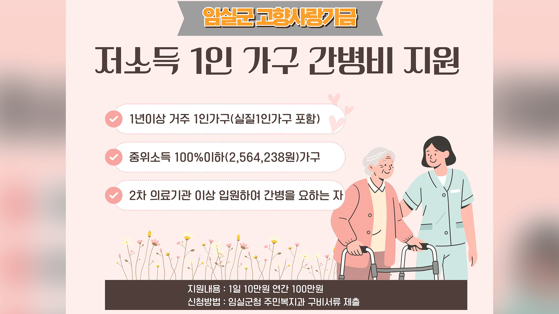 임실군이 고향사랑기부금으로 조성된 기금을 활용해 저소득 1인 가구 간병비를 지원합니다.