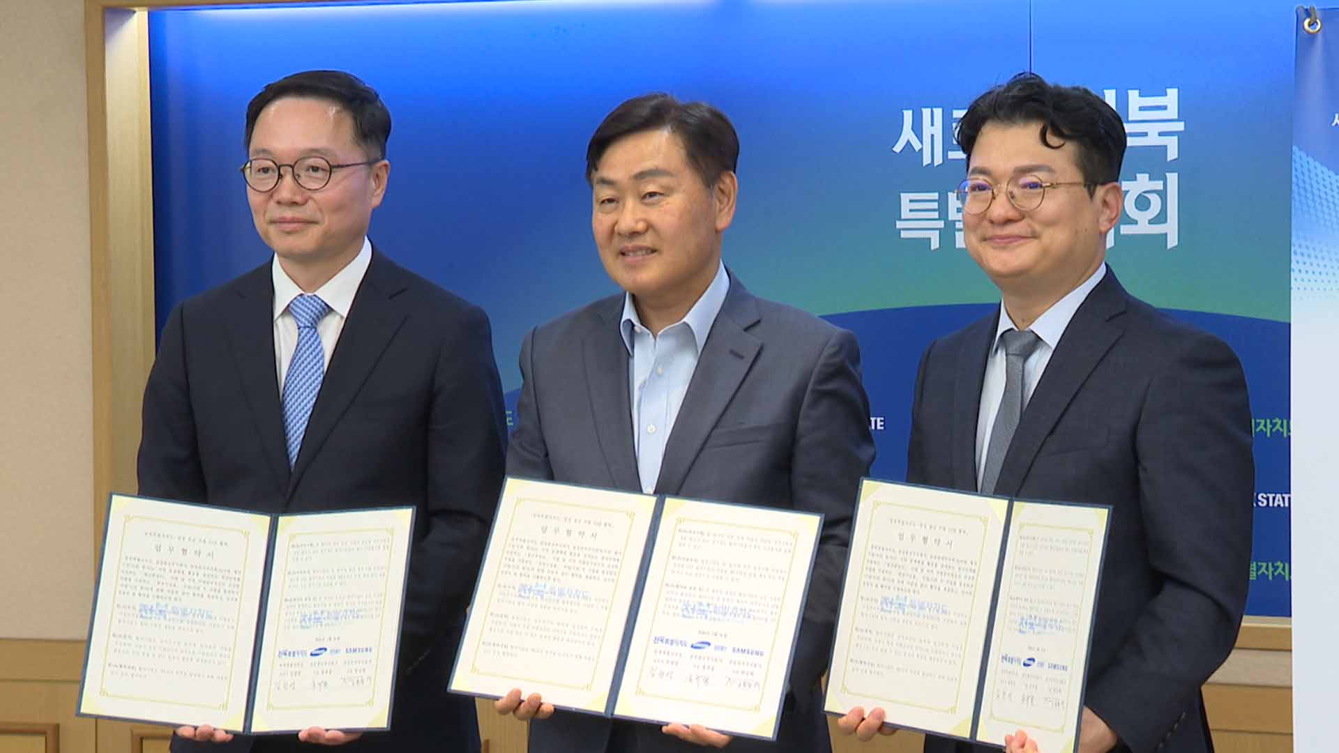 김관영 전북자치도지사는 오늘(31일) 삼성물산 송규종 사장과 삼성전자 정효명 부사장 등이 참석한 가운데 전북 청년 지원을 위한 업무협약을 맺었습니다.