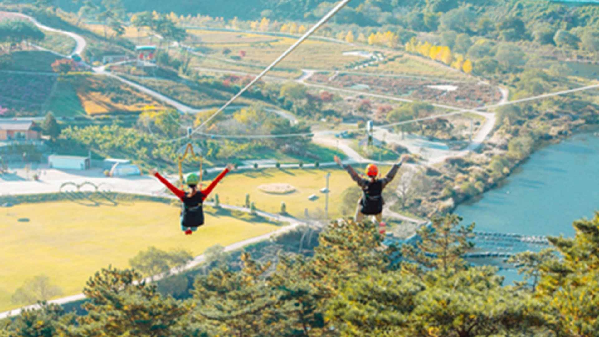 550m 길이의 집와이어는 정원의 전경과 추령천을 한눈에 감상할 수 있는 산림 레포츠 시설로 부치봉 정상 탑승장에서 출발합니다.