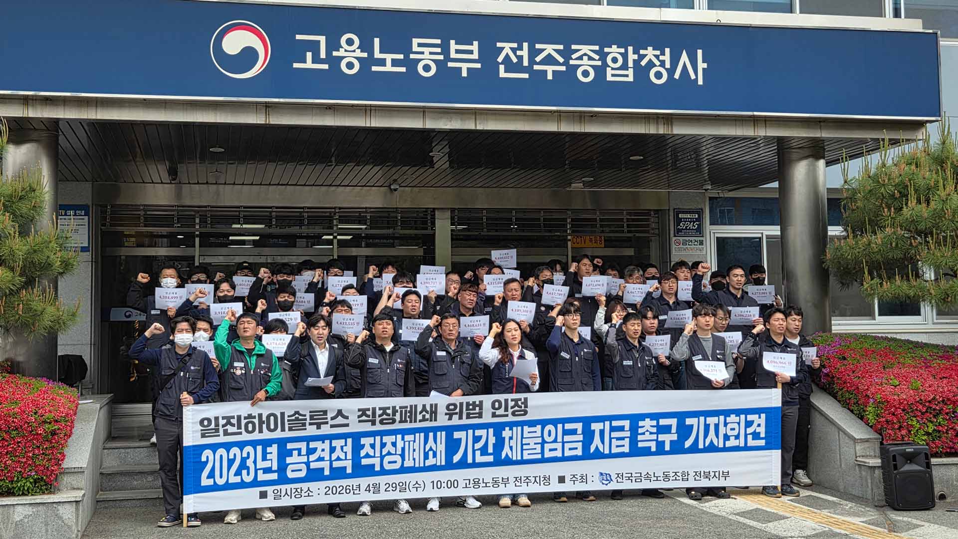 전국금속노동조합 전북지부는 지난 2023년 노동절 자정 무렵 일진그룹이 직장을 폐쇄한 것에 대해 최근 노동부가 임금 체불을 인정하고 시정 지시를 내렸지만, 사측이 이에 불응하고 있다며 형사 기소를 촉구했습니다.