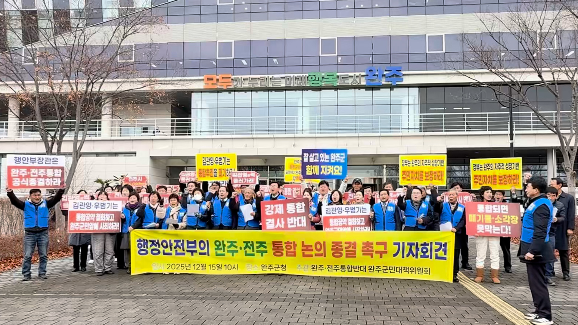 완주 지역 통합 반대 단체들이 전주·완주 통합 논의의 공식 종결을 요구했습니다.완주전주통합반대 완주군민대책위는 오늘(15일) 완주군청 앞에서 기자회견을 열고, "행정안전부는 군민의 명확한 의지를 반영해 통합 ...