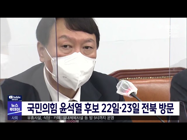 국민의힘 윤석열 대선 후보가 공식 일정으로는 처음으로 전북을 방문합니다. 윤석열 후보는 오는 22일부터 1박 2일동안 새만금을 비롯해 수소특화산단을 추진 중인 완주, 공공의대 설립이 현안인 남원 등을 찾아 ...