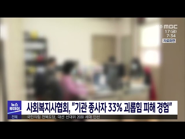 사회복지종사자 3명 중 1명꼴로직장 내 괴롭힘을 당했다는 설문 조사가 나와대책 마련을 촉구하는 목소리가 커지고있습니다.전라북도사회복지사협회가 지난 10월 사회복지기관 종사자 2백여 명을설문조사한 결과 33.2...