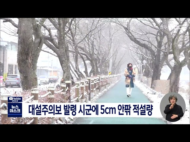 전라북도 지역은 눈발이 이어지며대부분 시군으로 대설특보가 확대되겠습니다.현재까지 적설량은순창 7.7센티미터, 정읍 6.9센티미터,부안 4.6센티미터 전주 2센티미터 등으로현재 대설주의보가 내려진 7개 시군을...