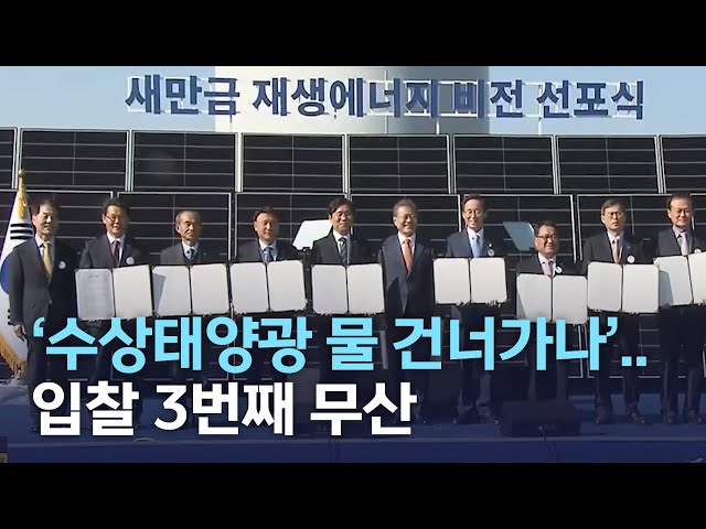 ◀ANC▶전북도민에게 7%의 수익금을 안겨주고태양광 산업도 일으키겠다던새만금 수상태양광이 좌초 위기를 맞고있습니다.사업비 4천2백억의 송전선로 건설 공사가3번의 공개 입찰에도 불구하고,응찰자가 나타나지 않기...