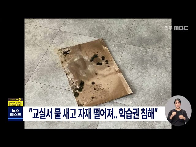 군산 지역 고교에서 누수 현상이 생겨학생들이 불편을 겪고 있습니다.전북외국어고등학교 일부 학부모들은지난주 폭우 직후 1학년 교실 천장에서물이 흘러내리고 자재 일부가 떨어져 나가는등이 시설 파손이 발생해 학생...
