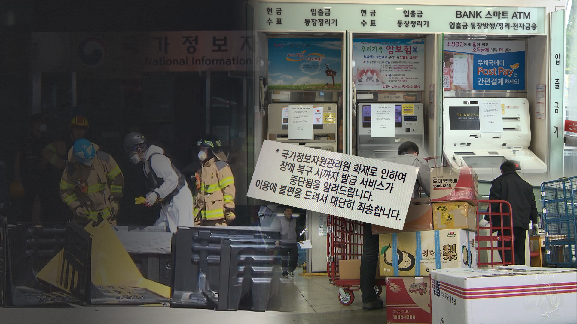 ◀앵커▶국가정보자원관리원 화재로 우체국 예금·보험 업무와 ATM 기기 이용이 중단되는 등 각종 대국민 서비스가 차질을 빚고 있습니다.추석을 앞둔 택배차도 멈춰 설 처지입니다. 민원서류 무인발급도 중단되는 등 ...
