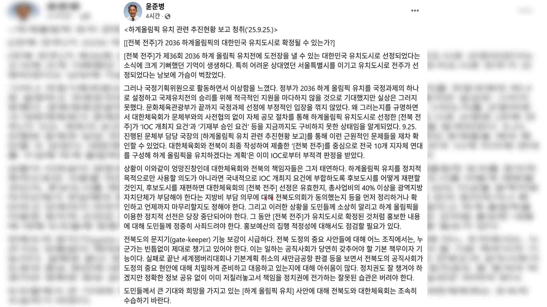 '2036 전주 하계올림픽' 유치 계획이 비현실적이라는 지적이 지역 정치권 내부에서 제기돼 파장이 예상됩니다.민주당 정읍·고창 지역구 윤준병 의원은 오늘(28일) 페이스북을 통해 “정부가 하계올림픽 유치를 국...