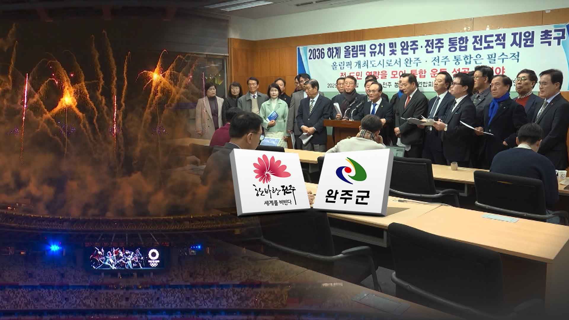 ◀ 앵 커 ▶평행선을 달리던 완주·전주 통합이 올림픽이 변수가 될 지도 모르겠습니다.당장 통합을 찬성하는 완주와 전주의 11개 단체는 최종 올림픽 개최지로 전주가 선정되려면 통합이 필수라고 주장했습니다.이창익...
