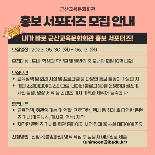 군산교육문화회관과 함께 발 맞추어 걸어갈 홍보 서포터즈를 6월 13일 화요일까지 모집합니다.개인소셜미디어 운영자 및 다양한 콘텐츠 제작에 관심 있으신 청취자 여러분들의 많은 관심 부탁드립니다!다양한 혜택과 소정의 원고료도 지급되오니 자세한 사항은 군산교육문화회관 홈페이지에서 확인해주세요! ^^