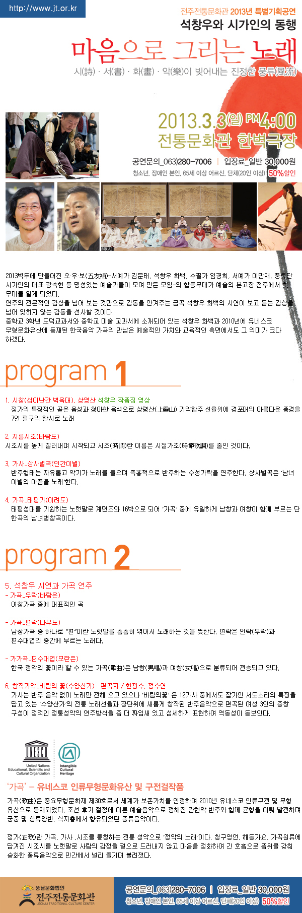 [전주전통문화관]2013특별기획공연 "석창우와 시가인의 동행"마음으로그리는 노래" 공연안내