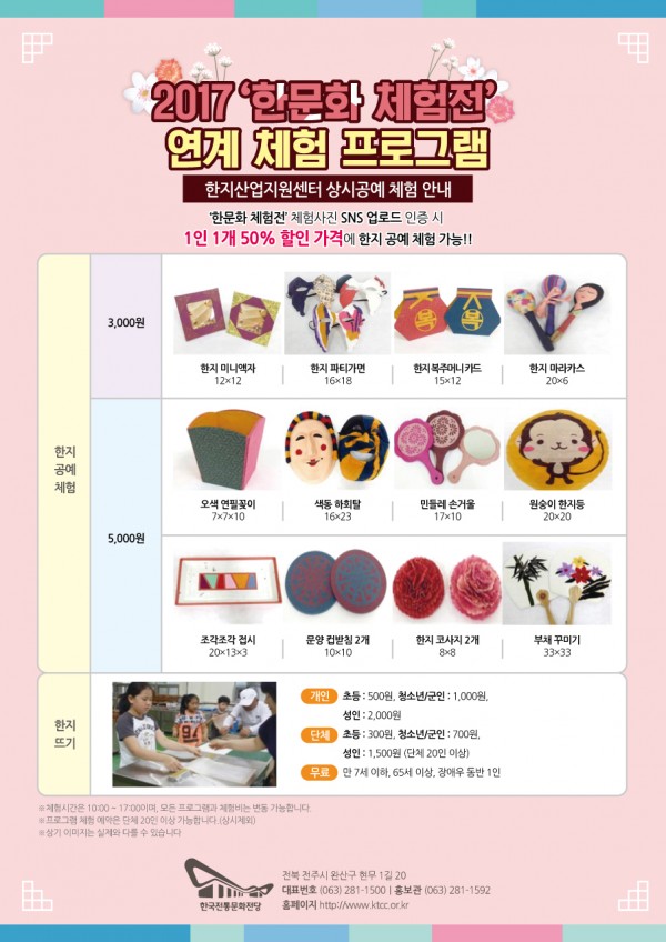 또한 체험에 참여하신 분들은 SNS에 태그를 걸어 사진을 올려주시거나, 체험 인증샷을 전당 관계자에게 보여주시면, 귀여운 기념품도 드리고~ 한지산업지원센터에서 진행하는 한지 공예체험도 50% 할인 된 가격으로 진행할 수 있답니다!!!